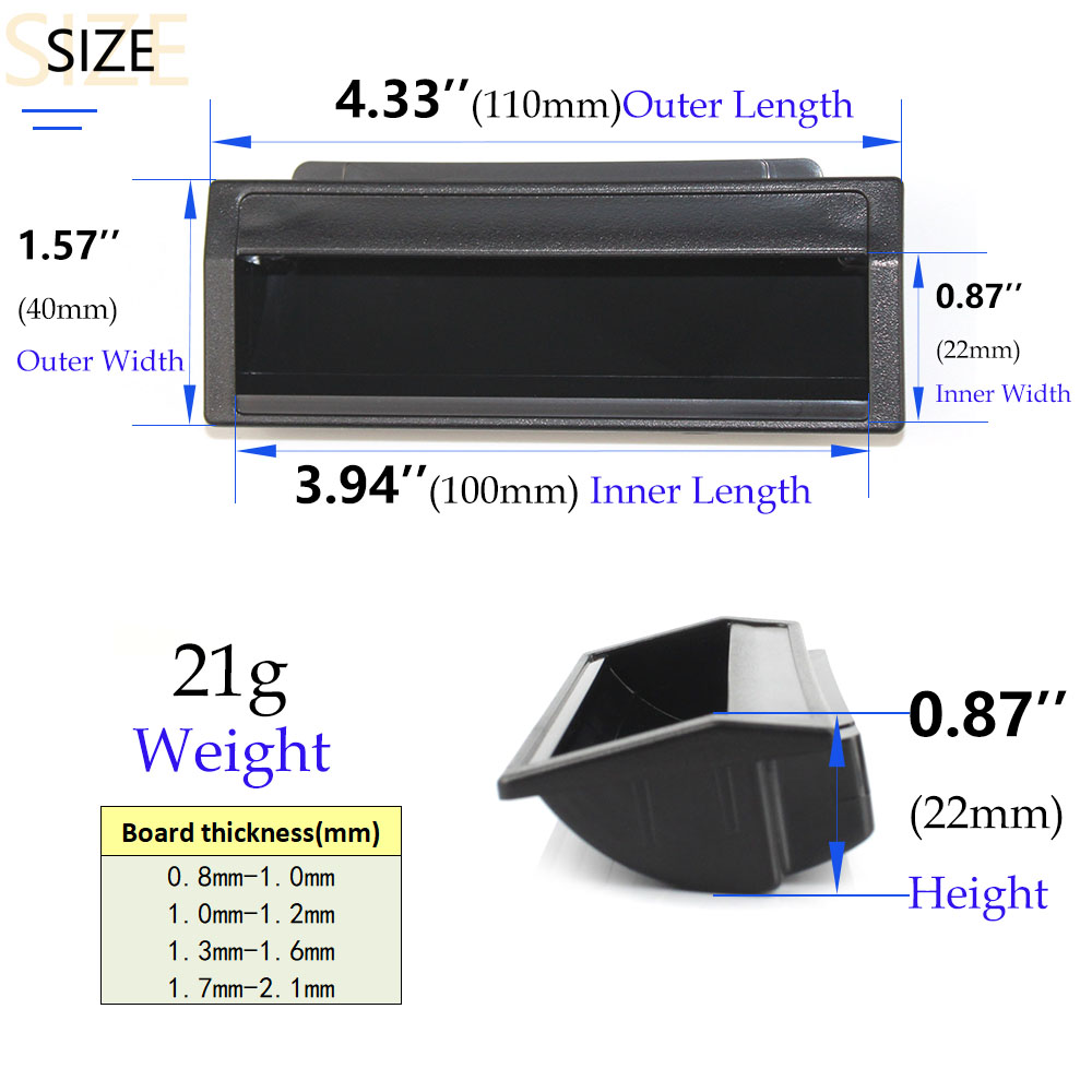 This ABS plastic embedded handle adopts an embedded buckle design, without the need for reserved holes. The buckle part is directly fixed to the board, ensuring easy installation and high stability. According to the thickness requirements of different devices, this handle is suitable for a wide range of board thicknesses: