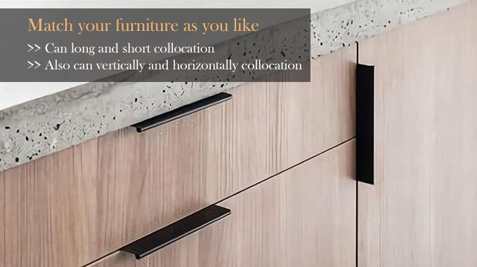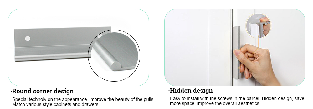 This finger pull handle is made of aluminum alloy, which is a lightweight, durable, and corrosion-resistant metal material with high strength and good oxidation resistance. Compared with other materials, aluminum alloy is not only lighter, but also has excellent corrosion resistance, which can withstand the wear and tear of daily use and environmental tests. Long term use is also not easy to rust or fade. It is suitable for use in various home environments, especially in damp or highly variable environments such as kitchens, bathrooms, etc.