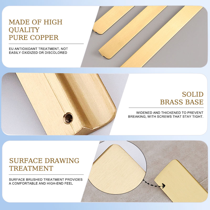 Solid brass flat pull handles is a high-end furniture accessory that combines aesthetics and practicality. It is made of high-quality solid brass material, with a simple and elegant design and a finely processed surface. It is suitable for a variety of furniture and environments, helping to elevate your furniture grade and add unique charm.