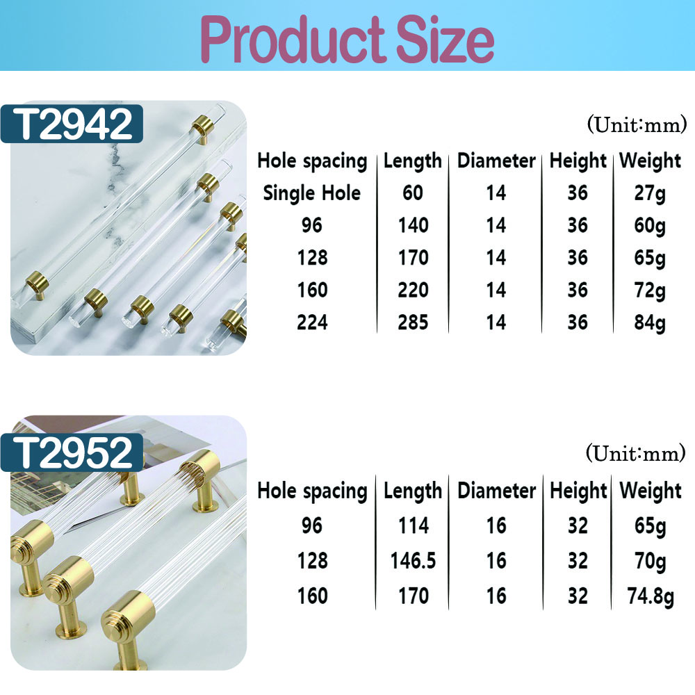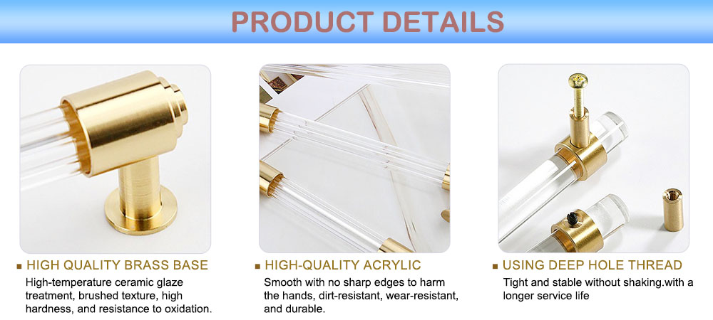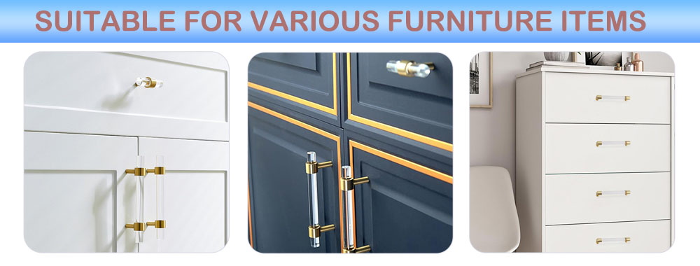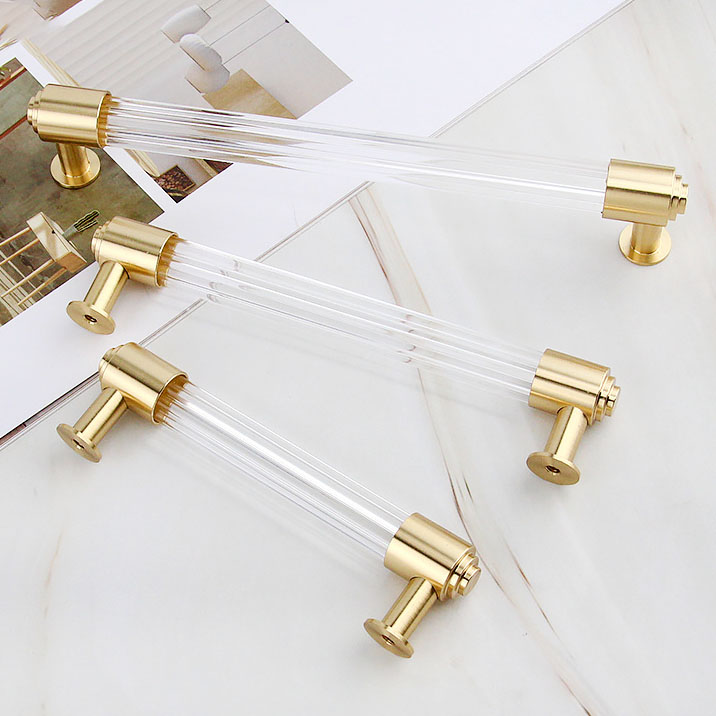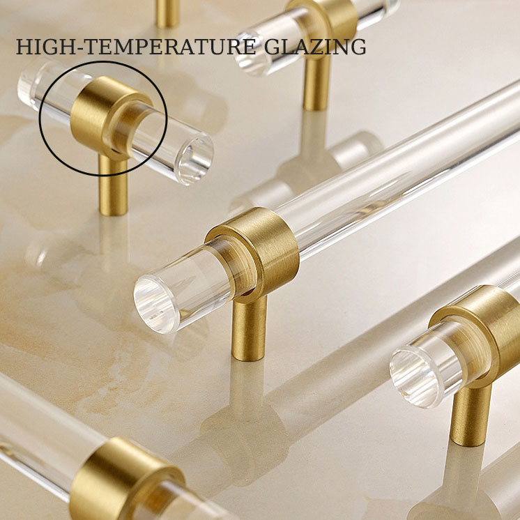 T-shaped acrylic brass furniture handle, with the perfect fusion of transparent acrylic and metal brass, has become a high-quality choice in modern furniture accessories. Its elegant appearance, diverse customization options, and wide applicability can meet daily functional needs while adding a fashionable texture to the space. Whether in home or commercial environments, this handle can showcase its unique charm.