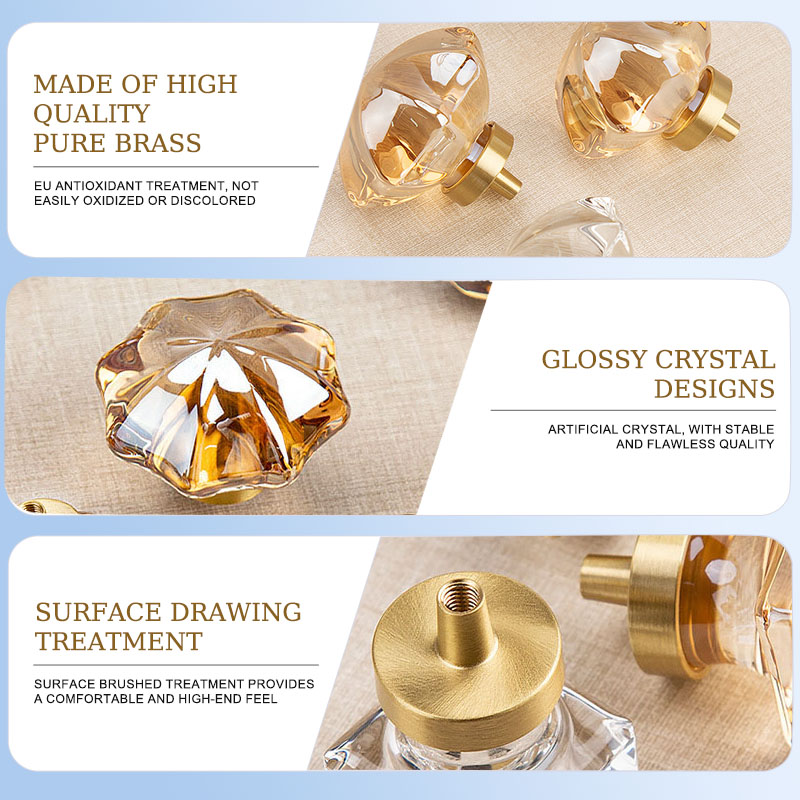 This starfish-shaped crystal brass cabinet door knob combines crystal and brass in a classic way, with a unique shape that’s both beautiful and durable. Suitable for various home settings, it enhances furniture style. Easy to install and maintain, it offers high-quality home life. Free samples and customization services give you flexibility in choosing the best style for your furniture.